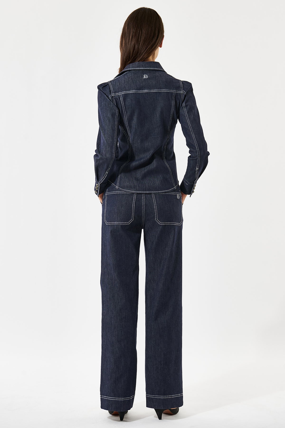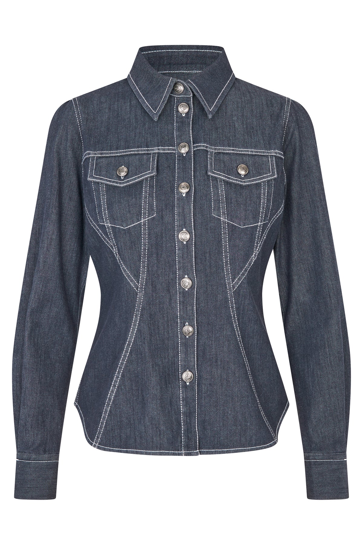 A wardrobe staple with directional detailing, the HenaDEA Denim Shirt blends Dea Kudibal’s Scandinavian precision with casual utility. Its dark indigo tone and white topstitching offer visual contrast, while the fitted cut and metallic buttons add refined edge.