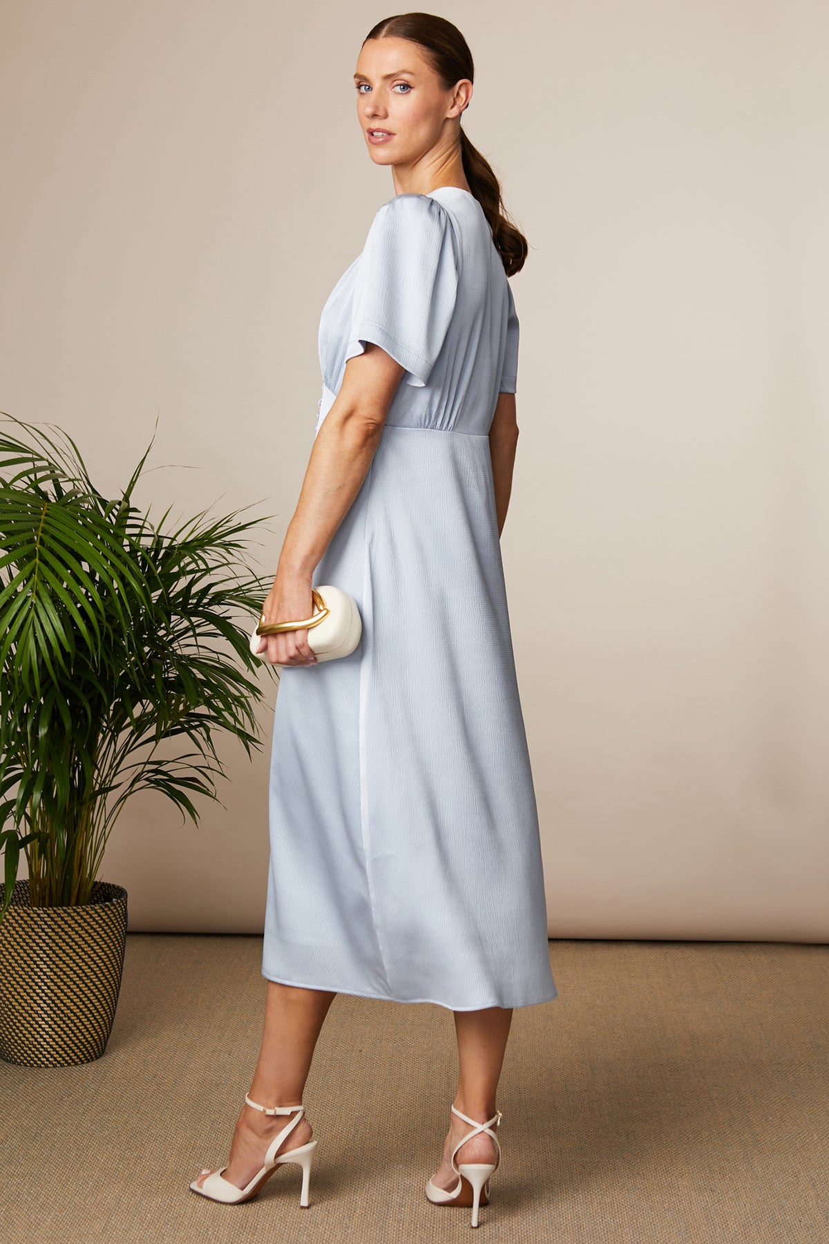 Soft, shimmering and beautifully flattering, the Fee G 831Y-57 Chrissie Silver Button Front Long Dress is made for weddings, parties and special evenings. Style 831Y-57 comes in a cool silver tone with a gentle sheen, featuring a V-neckline, short sleeves with subtle shoulder shape, and fabric-covered buttons running down the front to a neat split for easy movement. The defined waist seam creates a lovely shape without feeling too fitted, making it one of those pieces you’ll reach for whenever an invite lands.