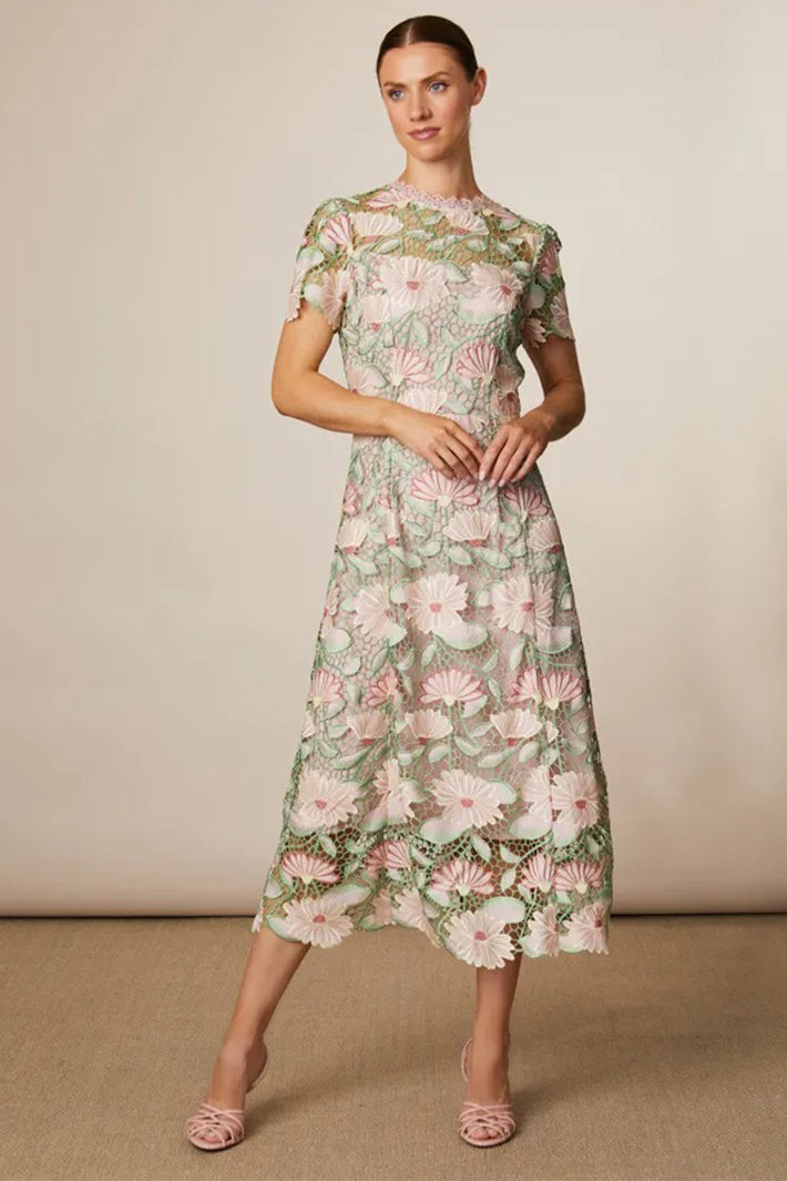 Style it with blush or nude heels and delicate jewellery to pick up the tones in the lace, then add a light wrap or cropped jacket for cooler moments.