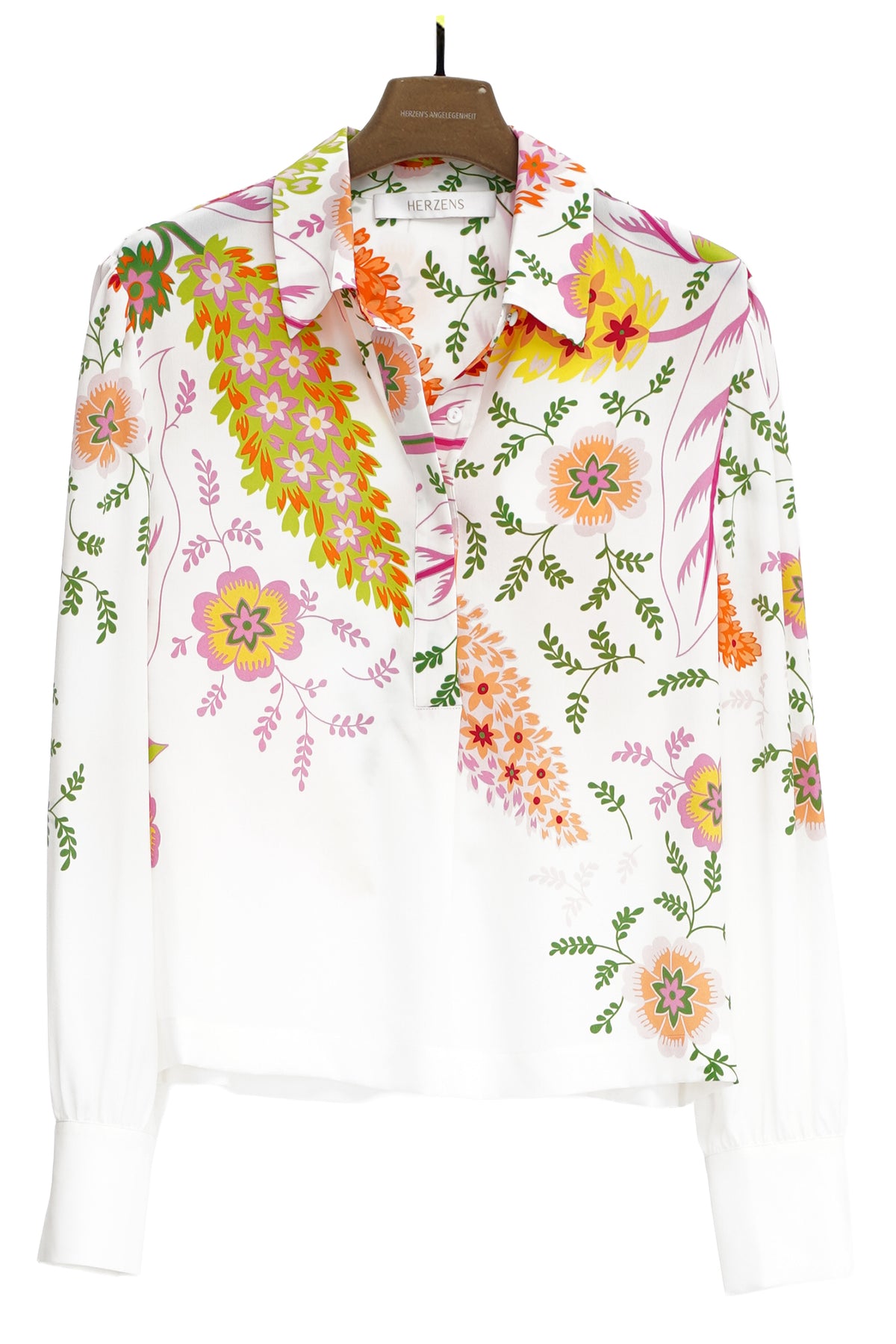 Brighten up your wardrobe with the Herzen's Angelegenheit Fuchsia Grape Multi Print Silk Blouse, a vibrant piece that brings colour and energy to any outfit. Crafted from luxurious silk, this blouse features a lively floral print in shades of fuchsia, grape, orange, and green on a crisp white base. The relaxed fit, classic collar, and long sleeves create a flattering silhouette that’s perfect for both work and weekend styling.