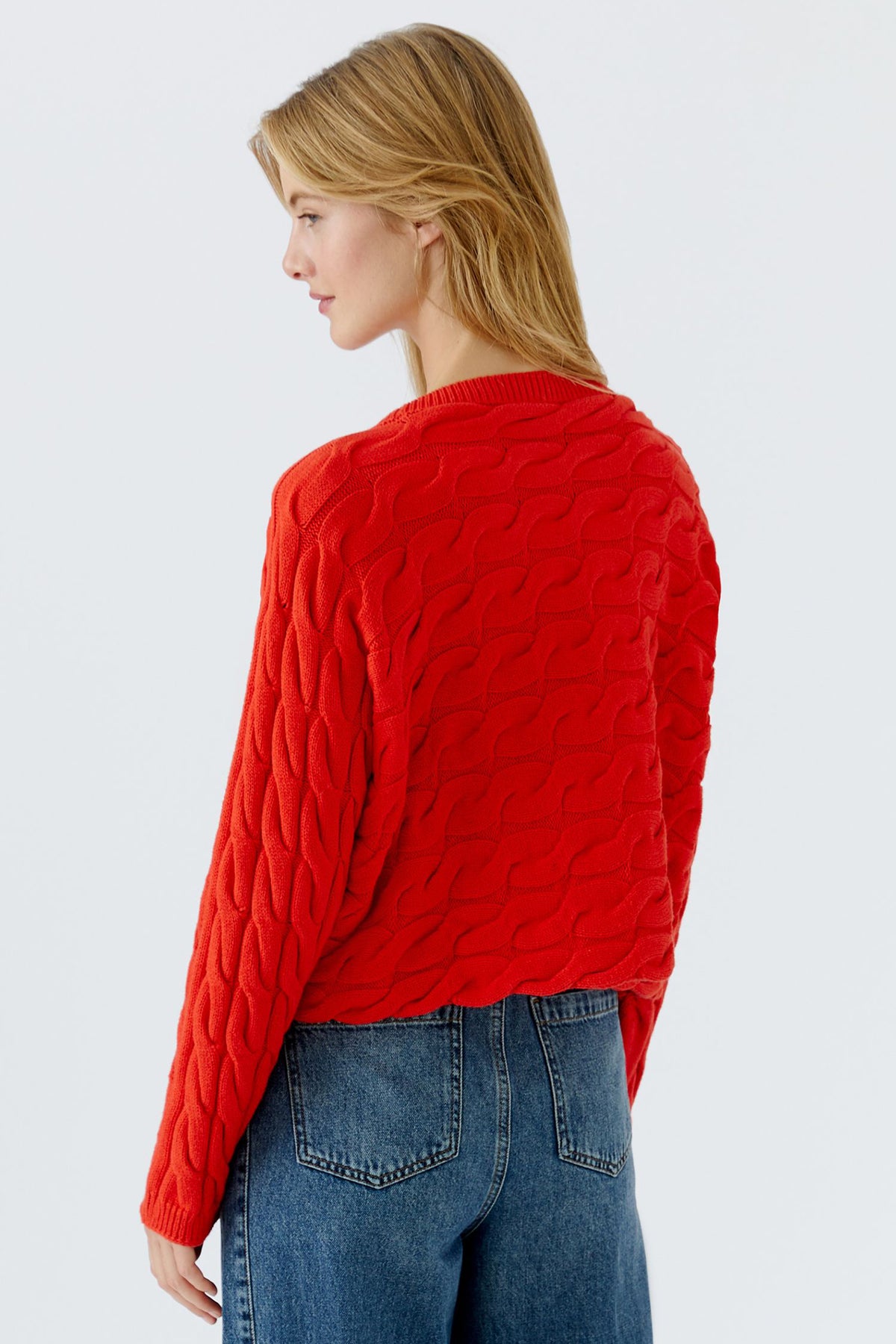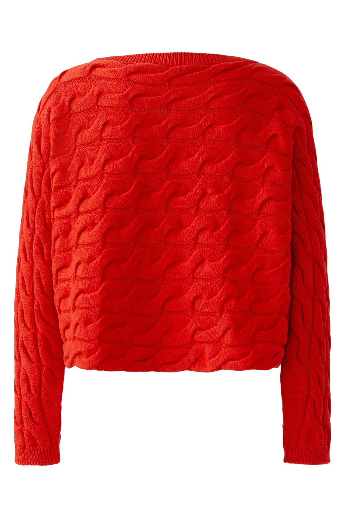 Oui 94609 Sirah Highrisk Red Jumper 3610 is a statement knitwear piece from Oui, designed in a bold cable-knit pattern and crafted in a soft cotton blend for comfort and structure. The cropped, boxy silhouette and boat neckline give it a modern edge, while the vibrant red shade adds impact to everyday styling.
