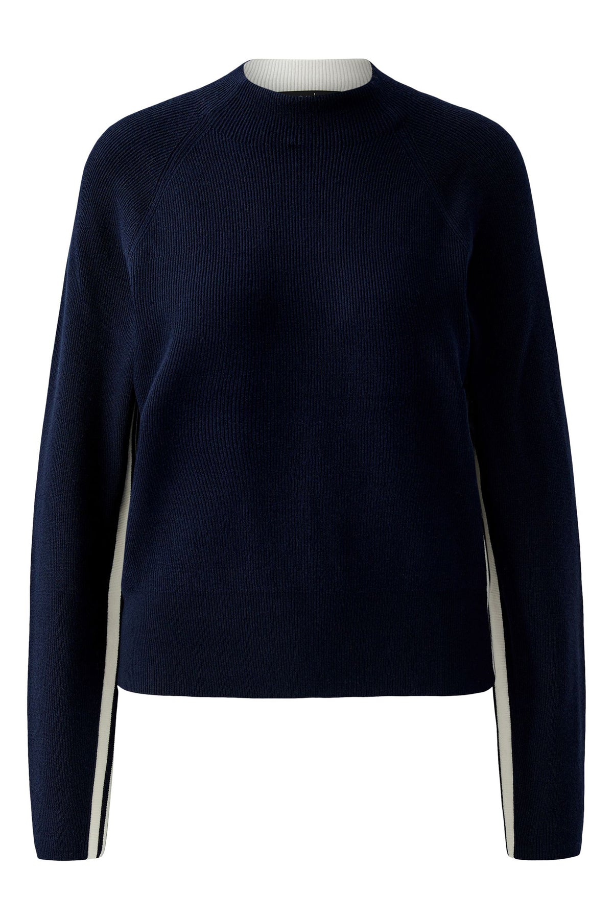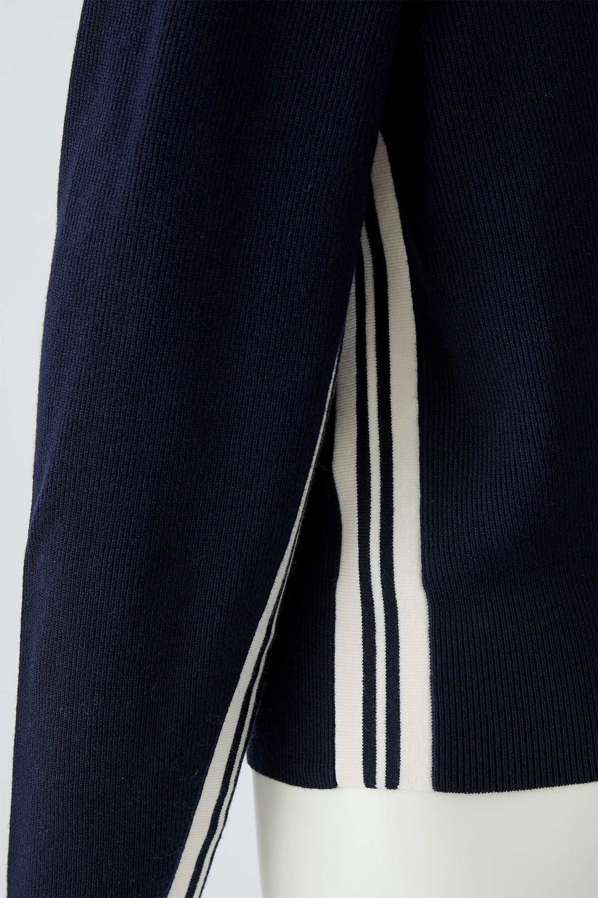 Oui 96090 Dark Blue Jumper 5742 is a refined knitwear piece crafted in a soft wool blend, designed with clean lines and subtle contrast detailing. Its dark blue tone and ribbed texture make it a versatile staple, while the stripe accents along the sleeves add a modern, sporty edge.