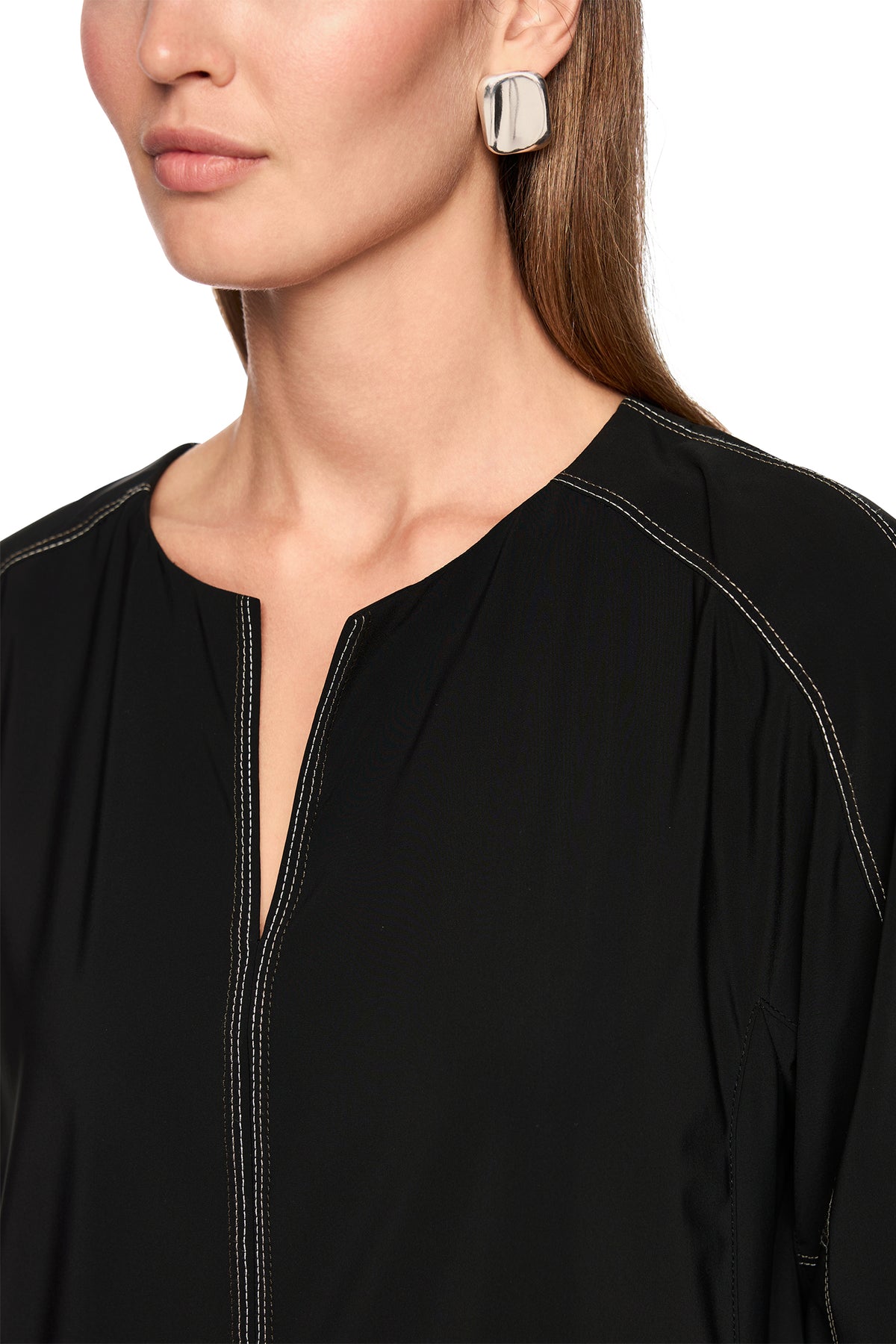 - Three-quarter length sleeves with subtle seam accents