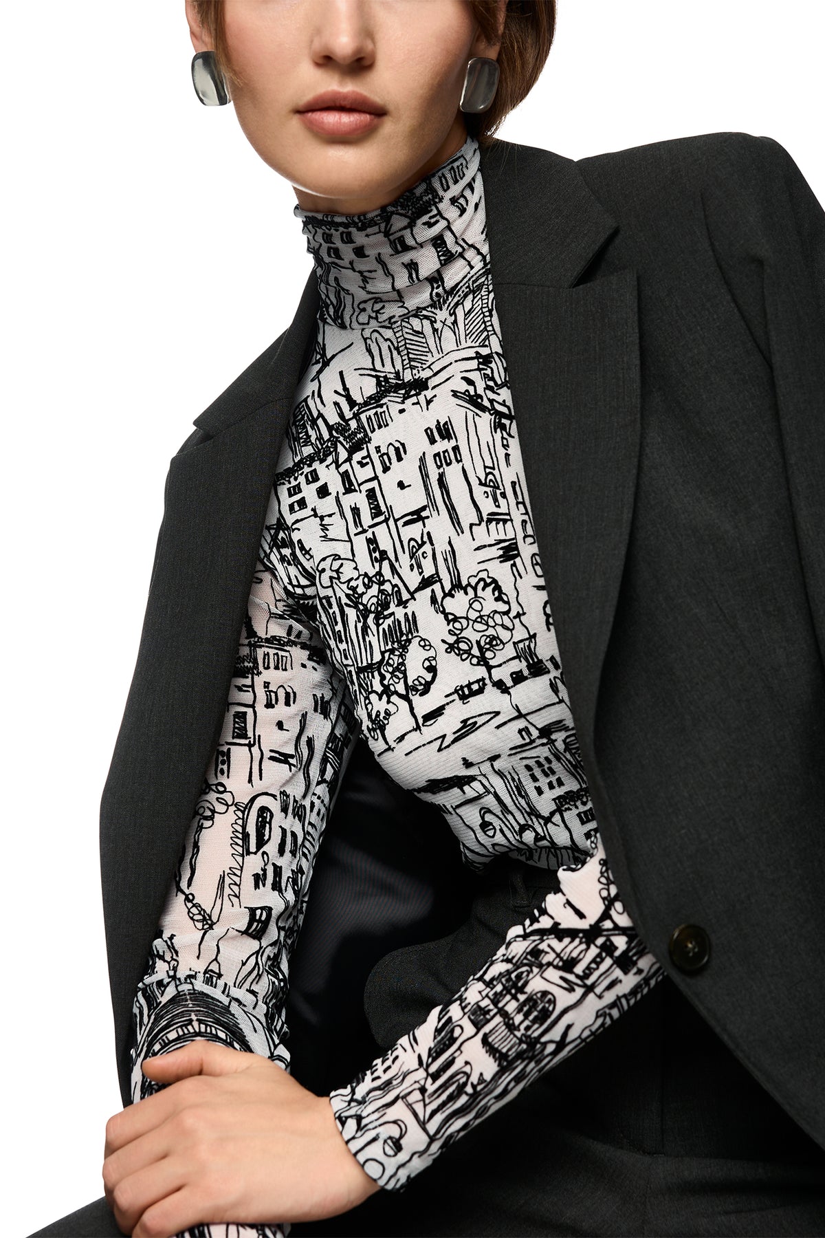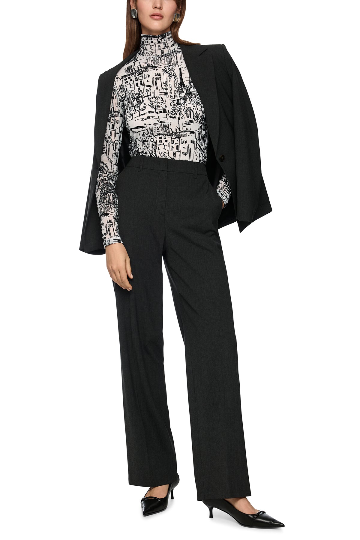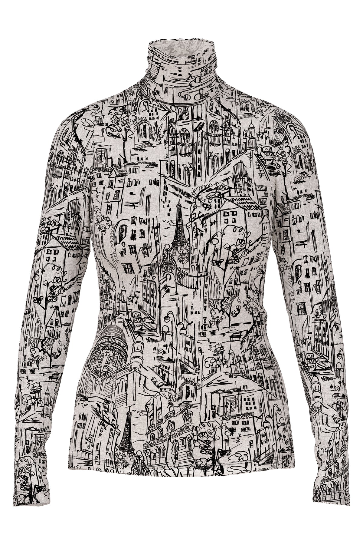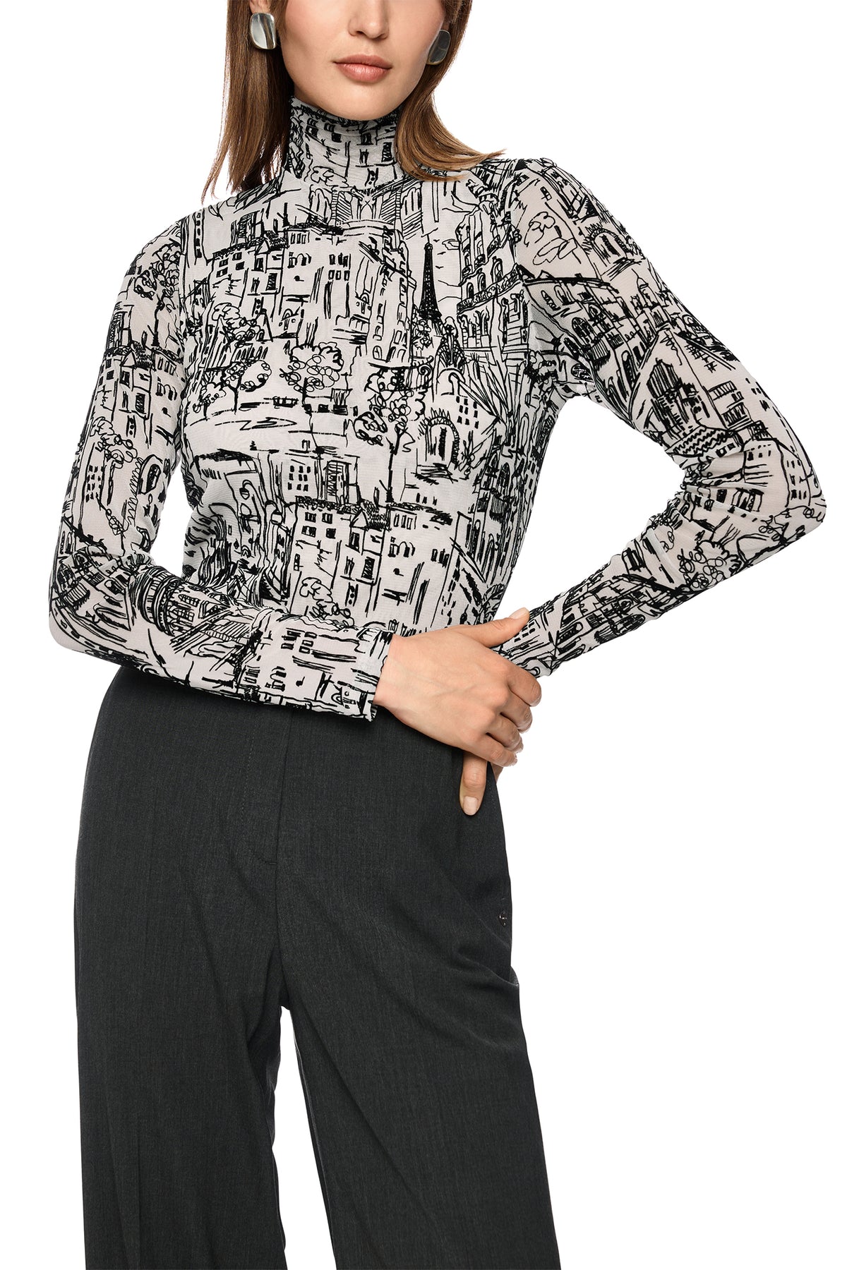 A graphic wardrobe piece with architectural edge, the Marc Cain ZC 48.12 J41 Long Sleeve Polo Neck Top blends artistic illustration, soft texture, and body-hugging structure. Its monochrome city motif and stretch viscose composition make it ideal for elevated daywear or gallery-ready edits.