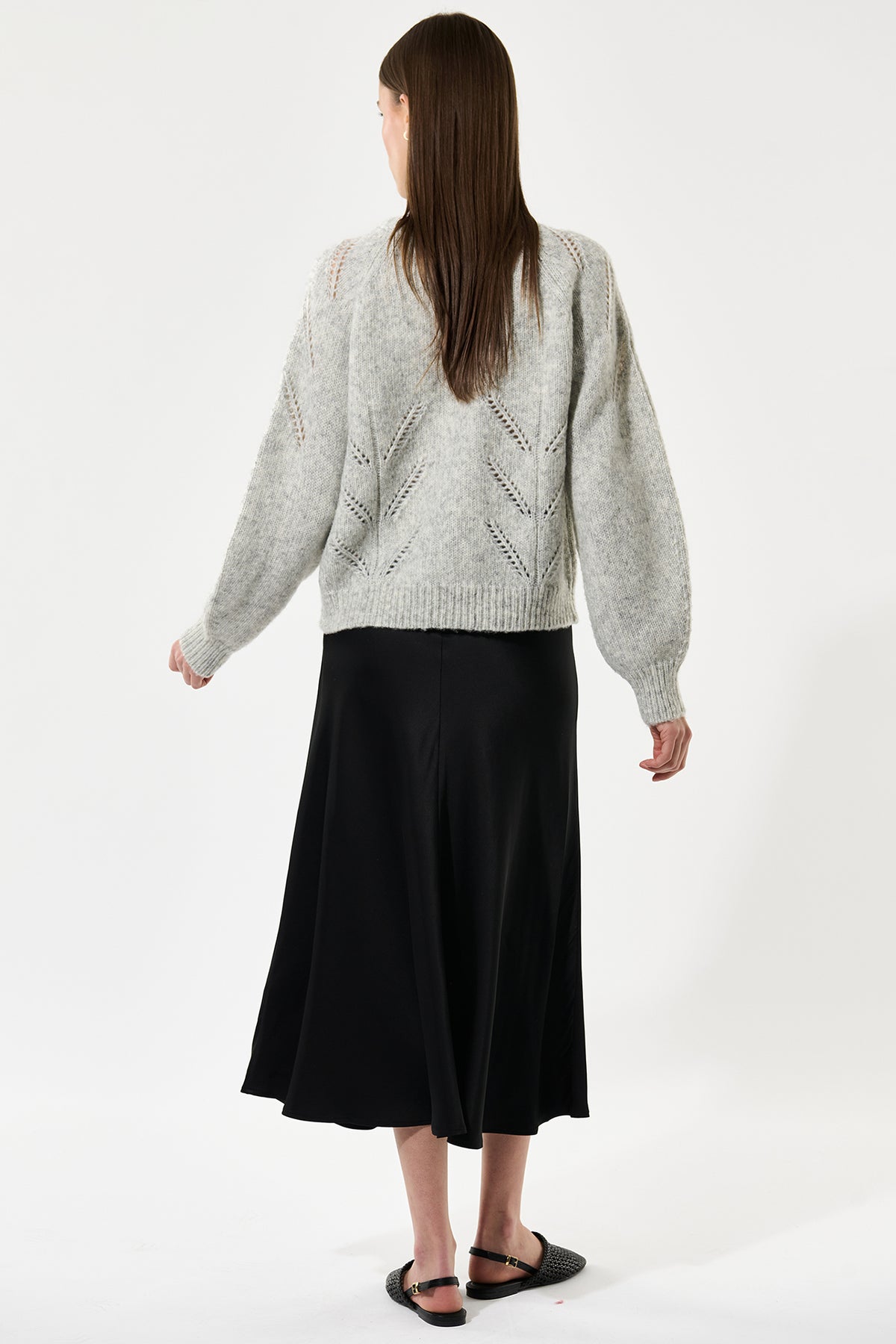 Style with a tucked-in printed blouse and heels for boutique polish, or layer with a cropped knit and ankle boots for gallery-ready ease. The skirt’s fluid shape and subtle shine make it a dependable choice for capsule edits or evening transitions.