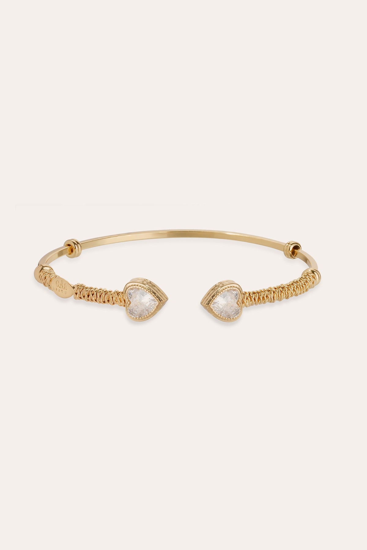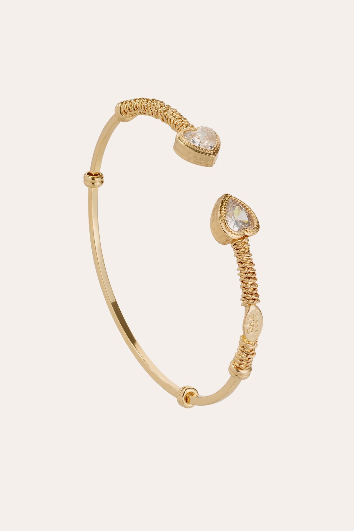 Gas Bijoux Duality Amore Bracelet Gold Plated 200 TU BDUALITYAMOREO is a handcrafted open bangle adorned with crystal hearts and wrapped wire detailing—ideal for romantic styling with artisanal French finesse.