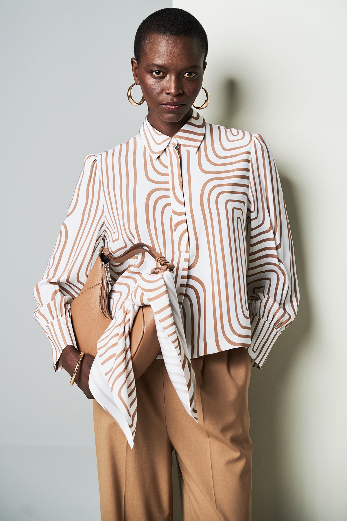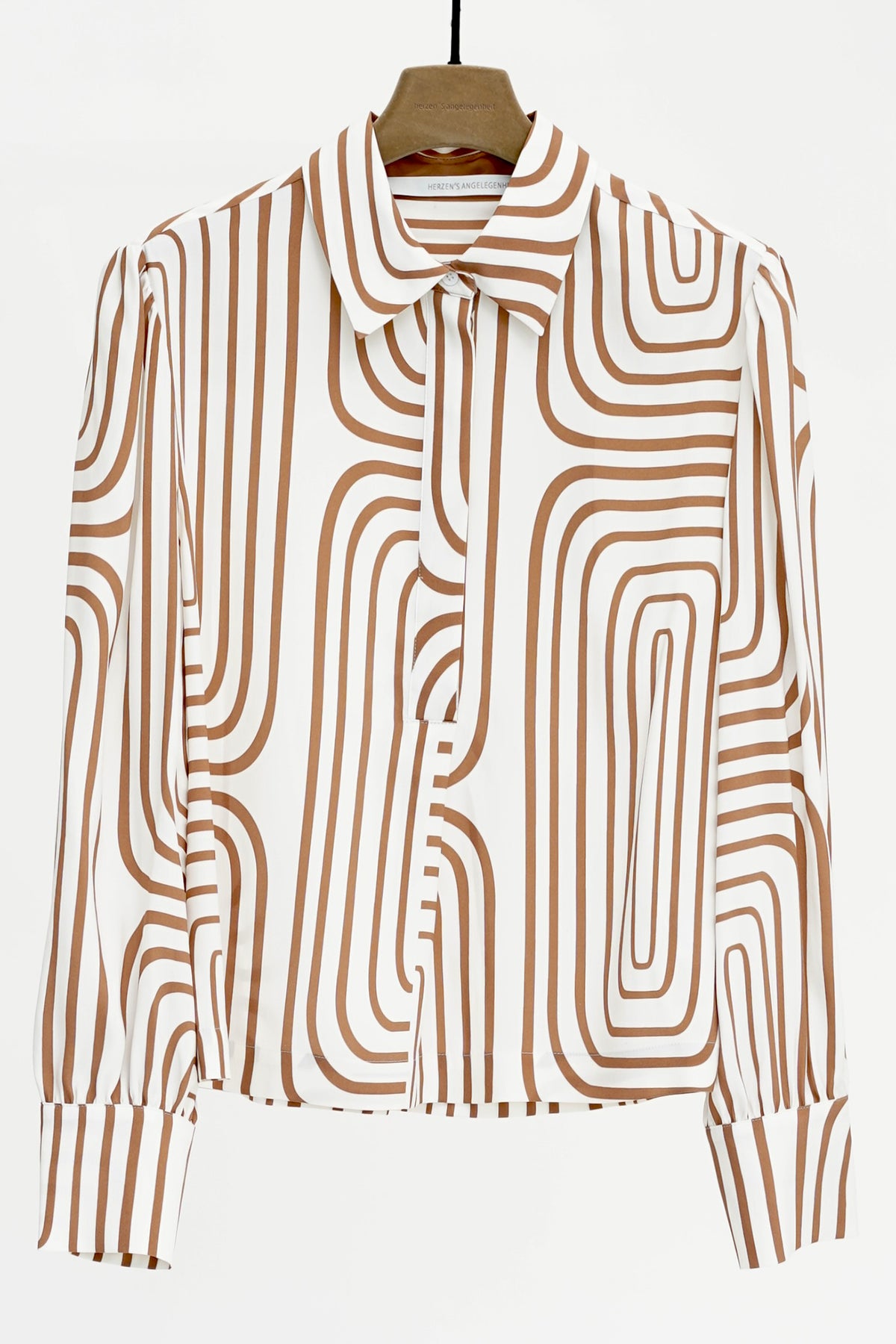 Add a graphic twist to your wardrobe with the Herzen's Angelegenheit 25254-6091 Taffy Stripe Superwhite Silk Blouse, a contemporary piece crafted in pure silk. Featuring rounded rectangular stripes in warm brown tones on a crisp white base, this blouse offers a modern take on classic tailoring. The concealed button placket and pointed collar keep the silhouette clean, while the fluid fabric ensures elegant drape.