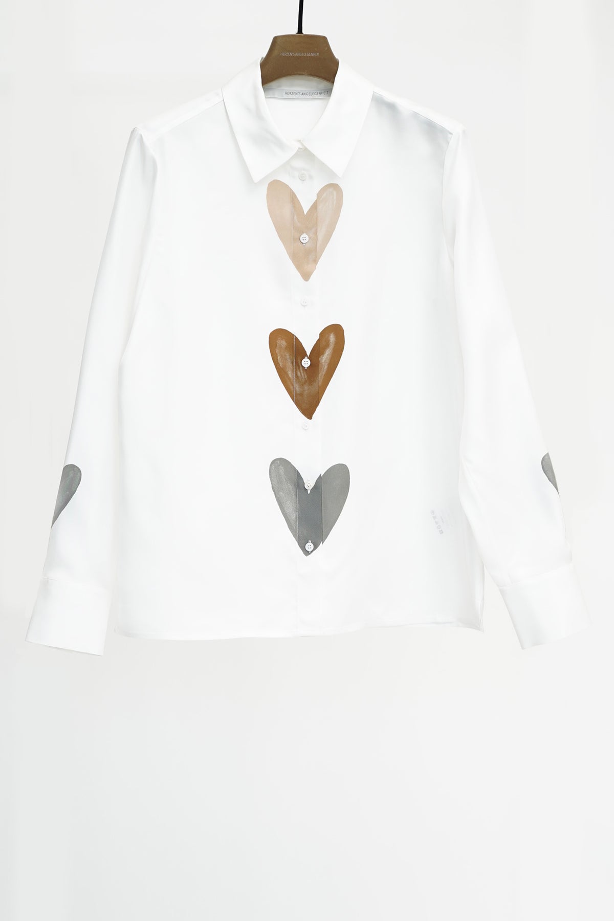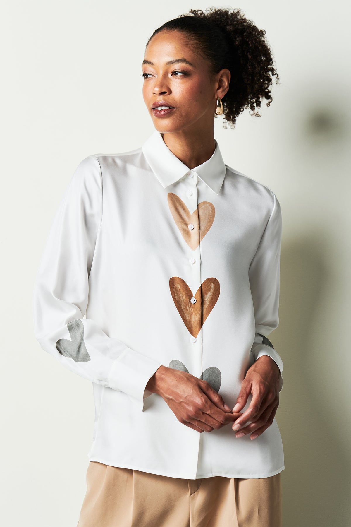 Make a statement with the Herzen's Angelegenheit 25254-6166 Taffy Sea Multi Heart Silk Blouse, a playful yet elegant piece in pure silk. Designed in crisp white with oversized heart motifs in soft neutral tones, this blouse blends romantic charm with modern minimalism. A trio of hearts cascades down the front, while subtle elbow accents add a whimsical touch.