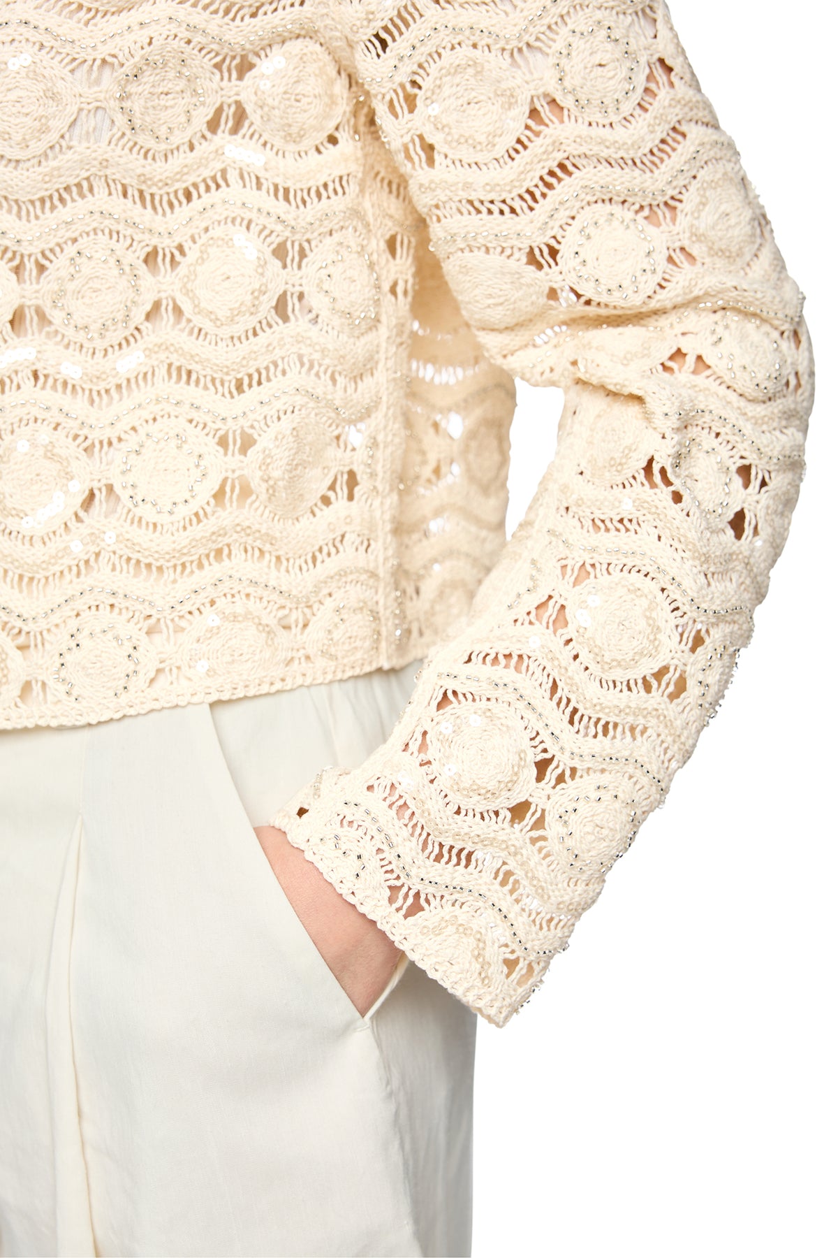 • Bright ecru openwork fabric with a lace-style texture