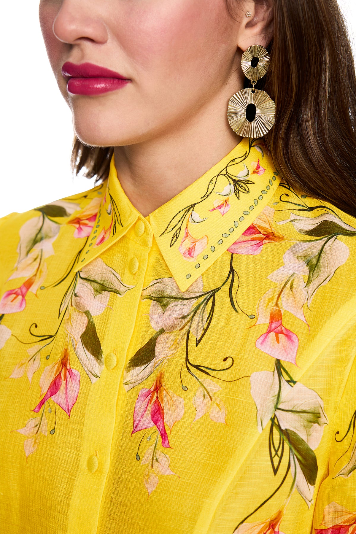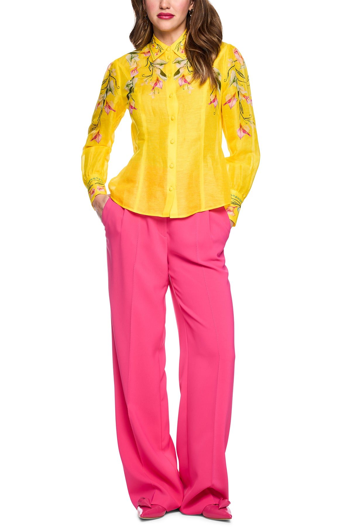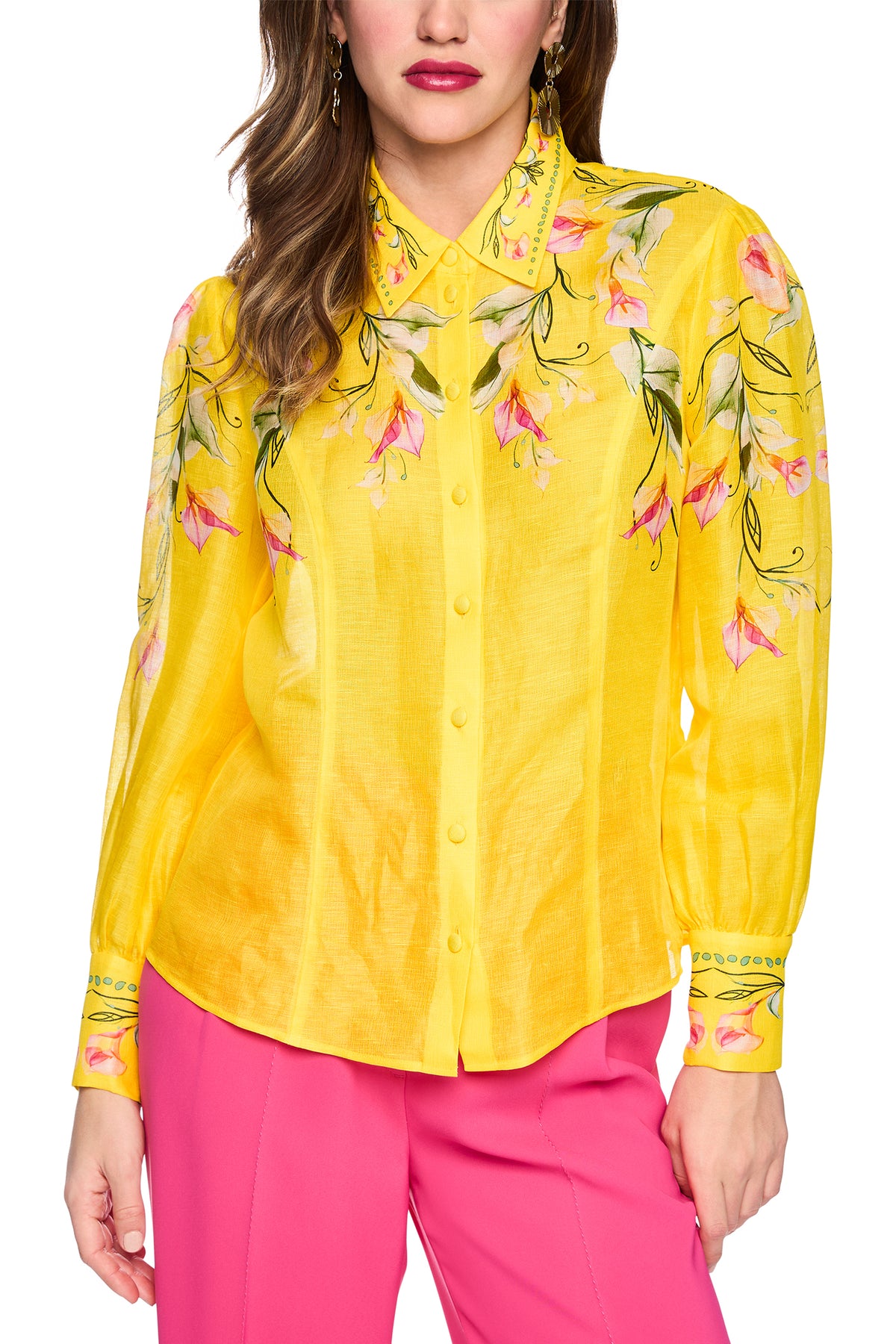 Brighten your day in the Marc Cain Glam AG 51.14 W13 Vibrant Yellow Calla Print Linen Silk Blouse. Designed in a stunning vibrant yellow with a beautiful calla lily print in pink, cream and green, this luxurious linen-silk blend blouse features a classic collar, button-through front and long sleeves with decorative cuff detail. The lightweight fabric drapes beautifully for effortless, polished style.