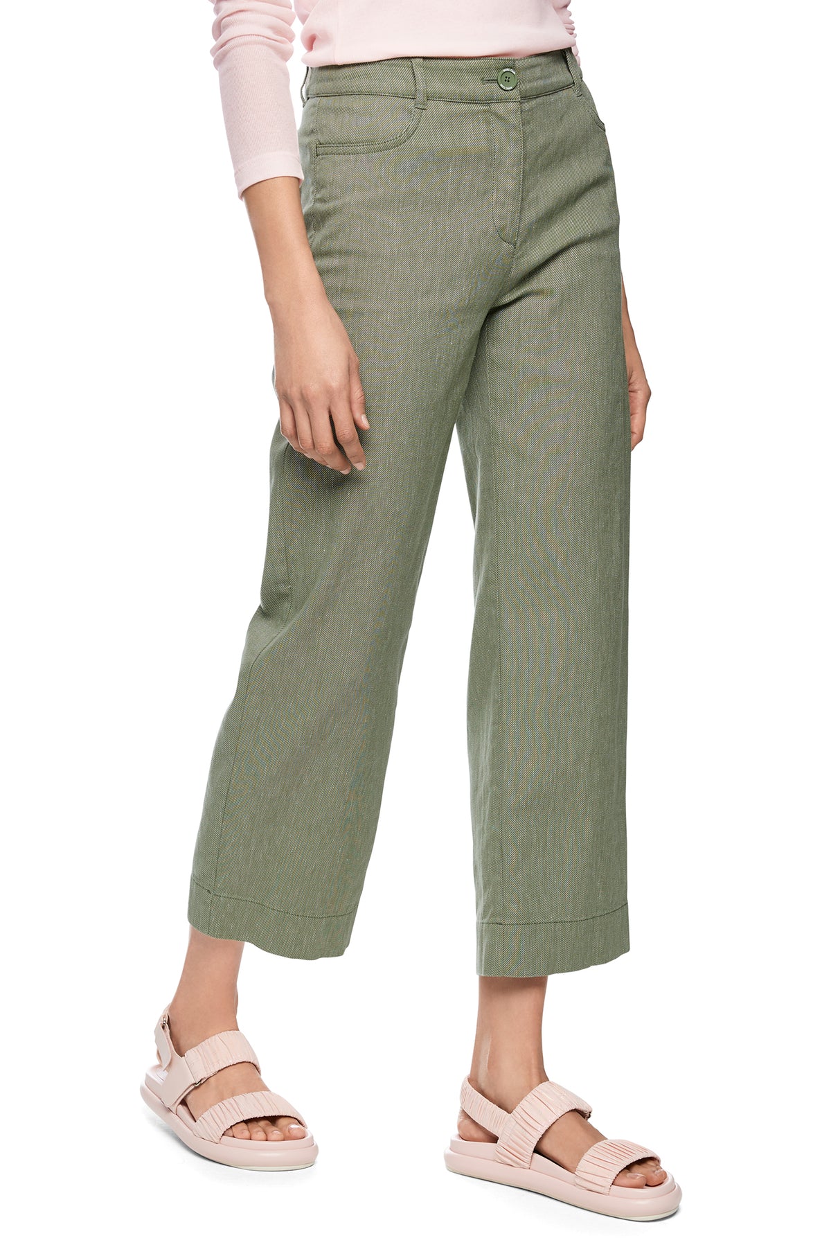 Perfect for: women’s green linen blend trousers, cropped wide leg summer trousers, Marc Cain Sports olivine trousers to wear with sandals.