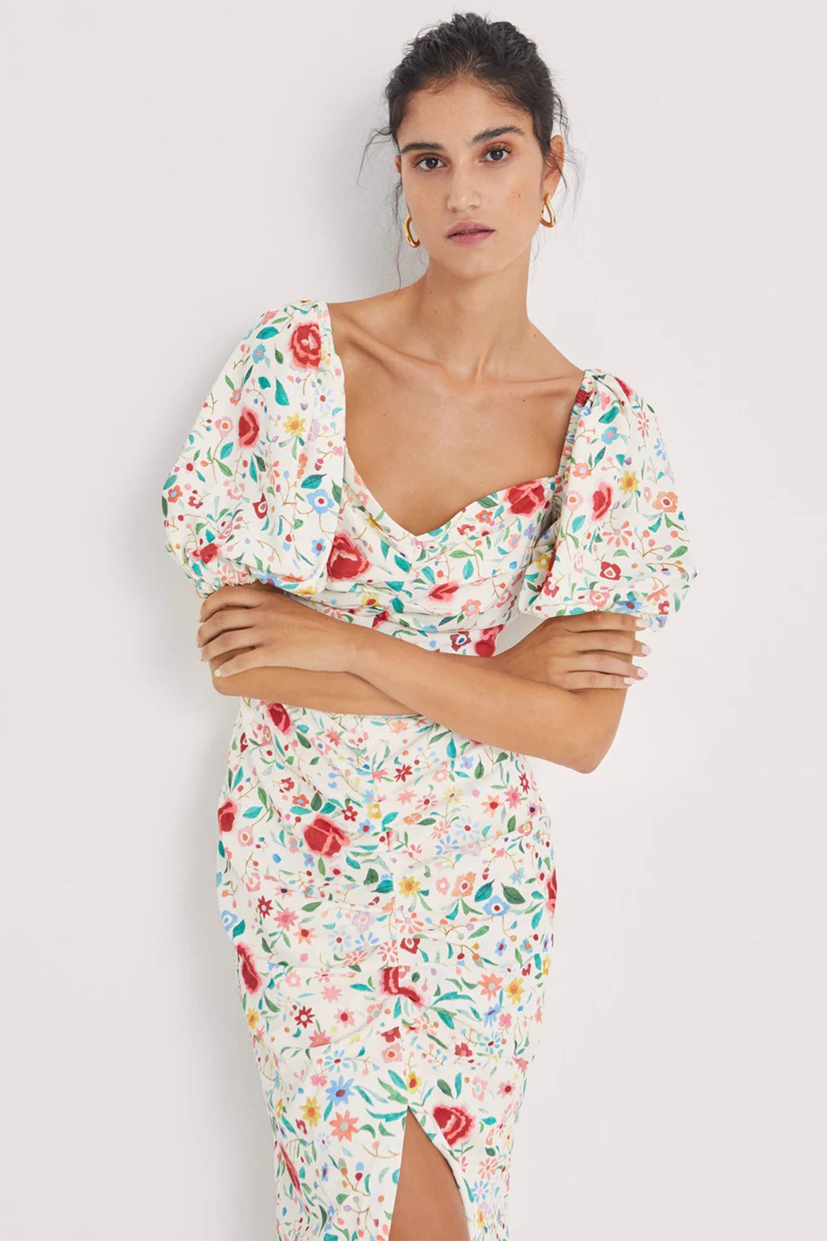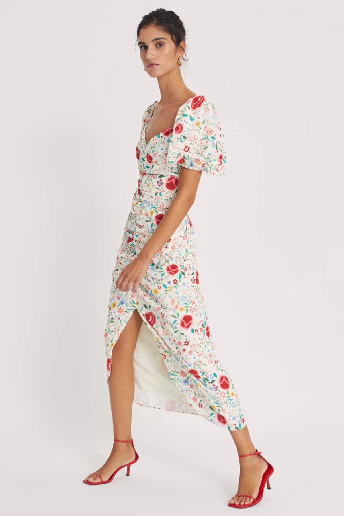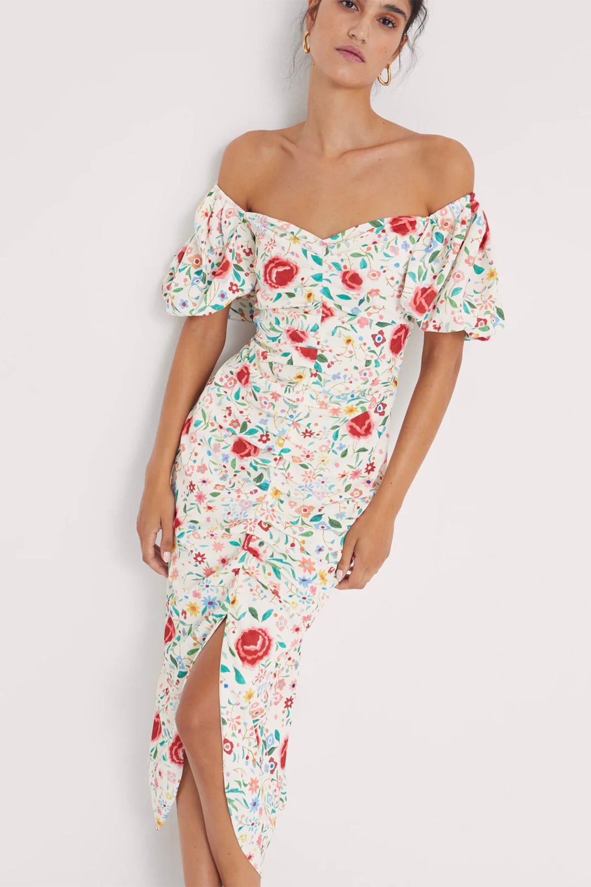 Bring colour and charm to any occasion in the Mioh Rita Manila Off-White Shawl Floral Print Draped Midi Dress – a beautifully feminine piece in a vibrant, all-over floral print on an off-white base. With its draped silhouette, puffed sleeves and flattering off-shoulder neckline, this midi feels both romantic and effortlessly wearable.