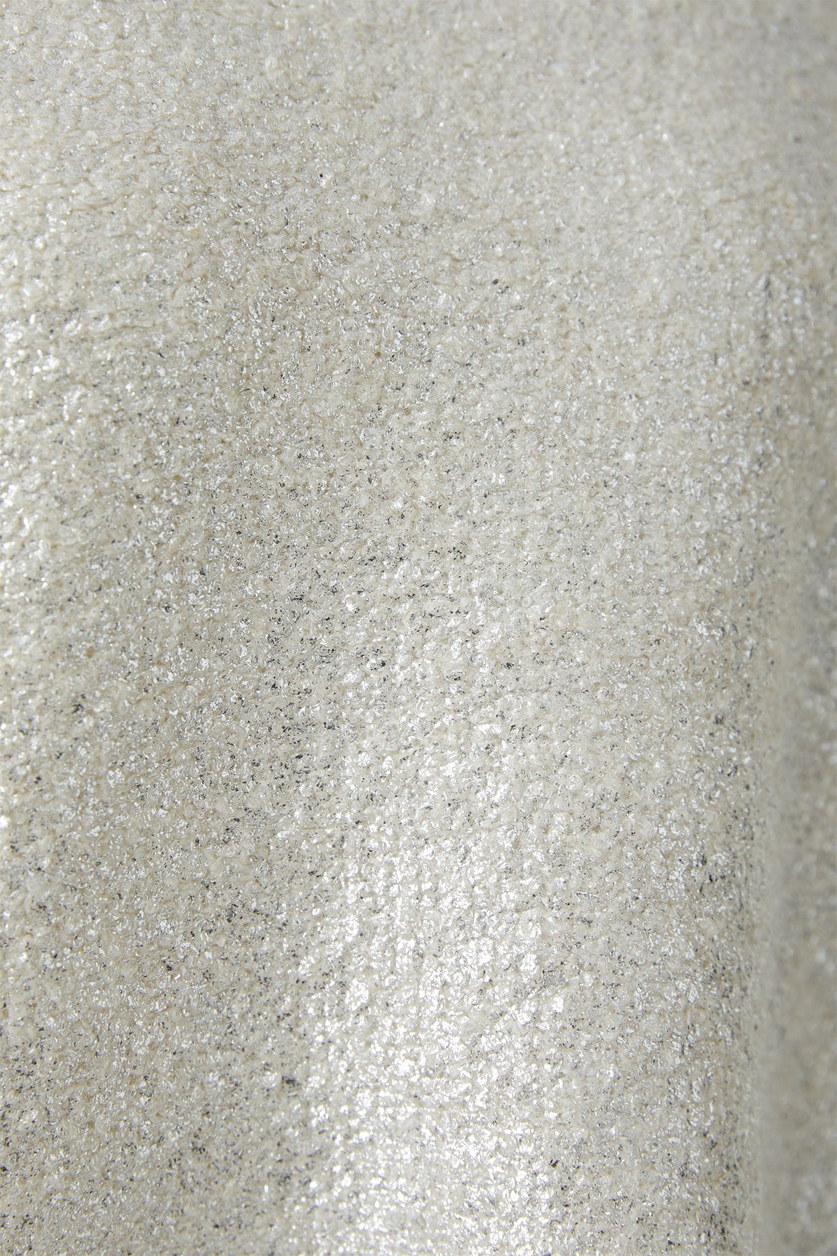 Close-up of a person wearing a silver sequin dress on a light gray background