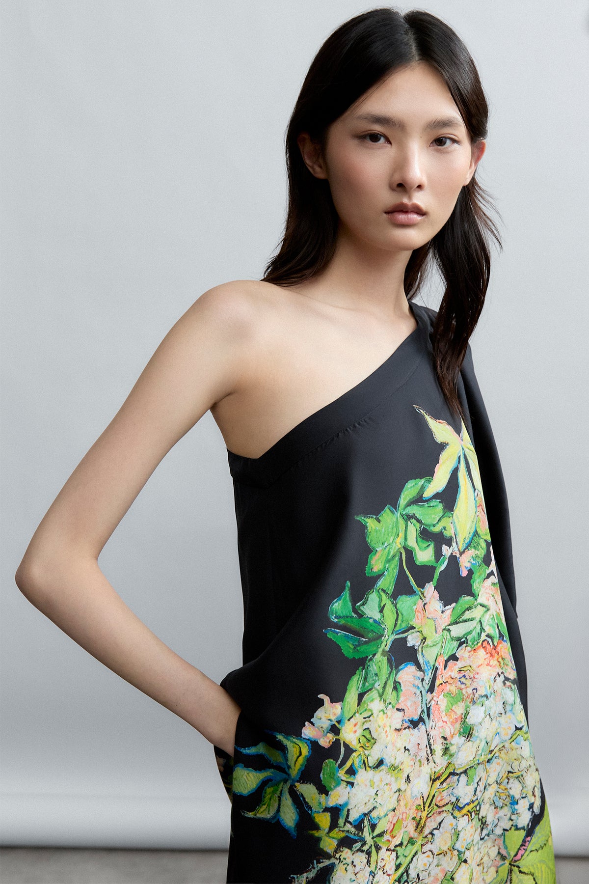 Make a statement in the Psophia 224DRS2695 Black Print Silk One Shoulder Dress – a striking occasion piece with an artistic floral placement print set against a deep black base. Cut in a flowing maxi length with a dramatic one-shoulder neckline and a voluminous sleeve, it’s designed to feel effortless whilst still looking seriously special.