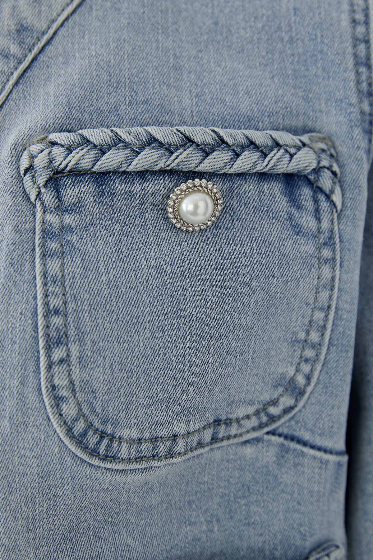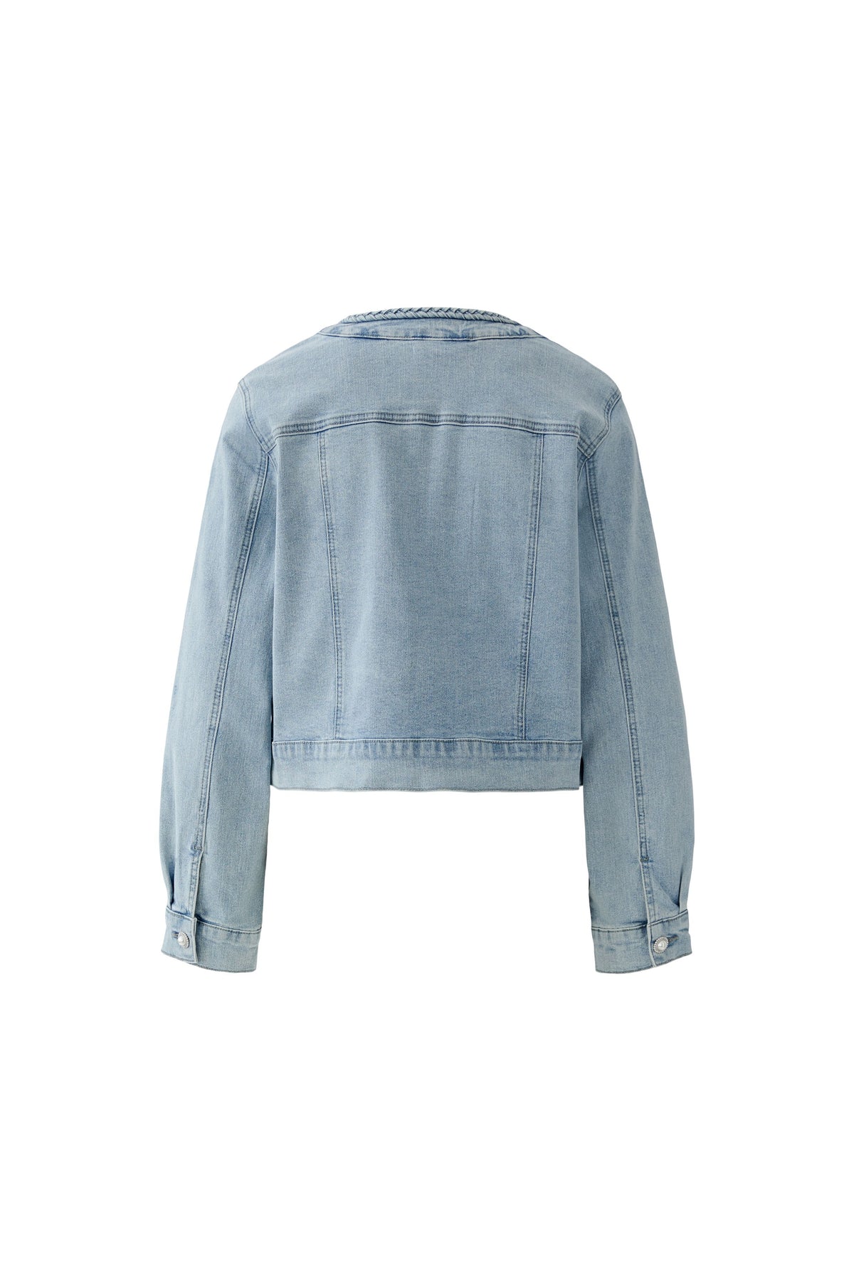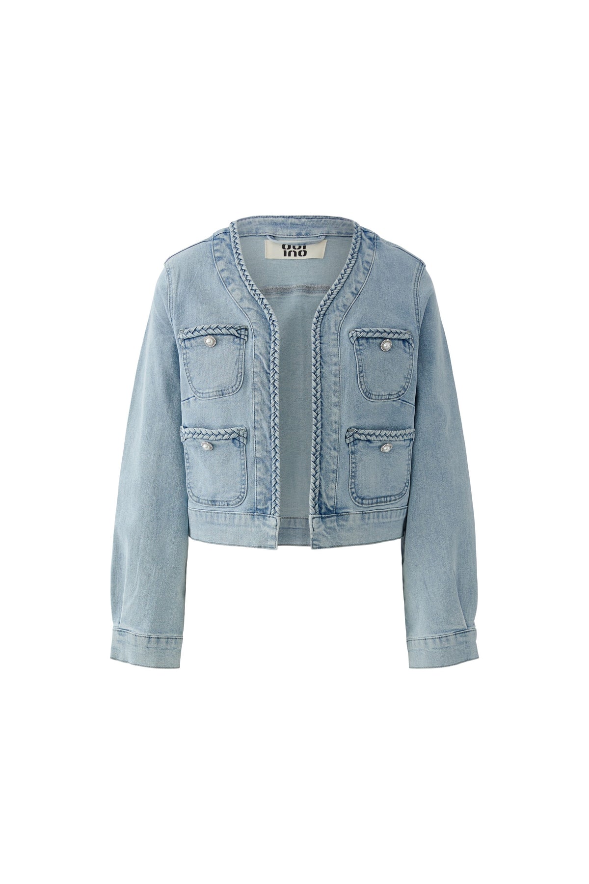 Oui 96342 Blue Denim Jacket 5300 is a cropped denim layer with braided trim and pocket detail—perfect for adding texture to everyday looks. The Blue style is designed with flap pockets and a round neckline for a modern finish.