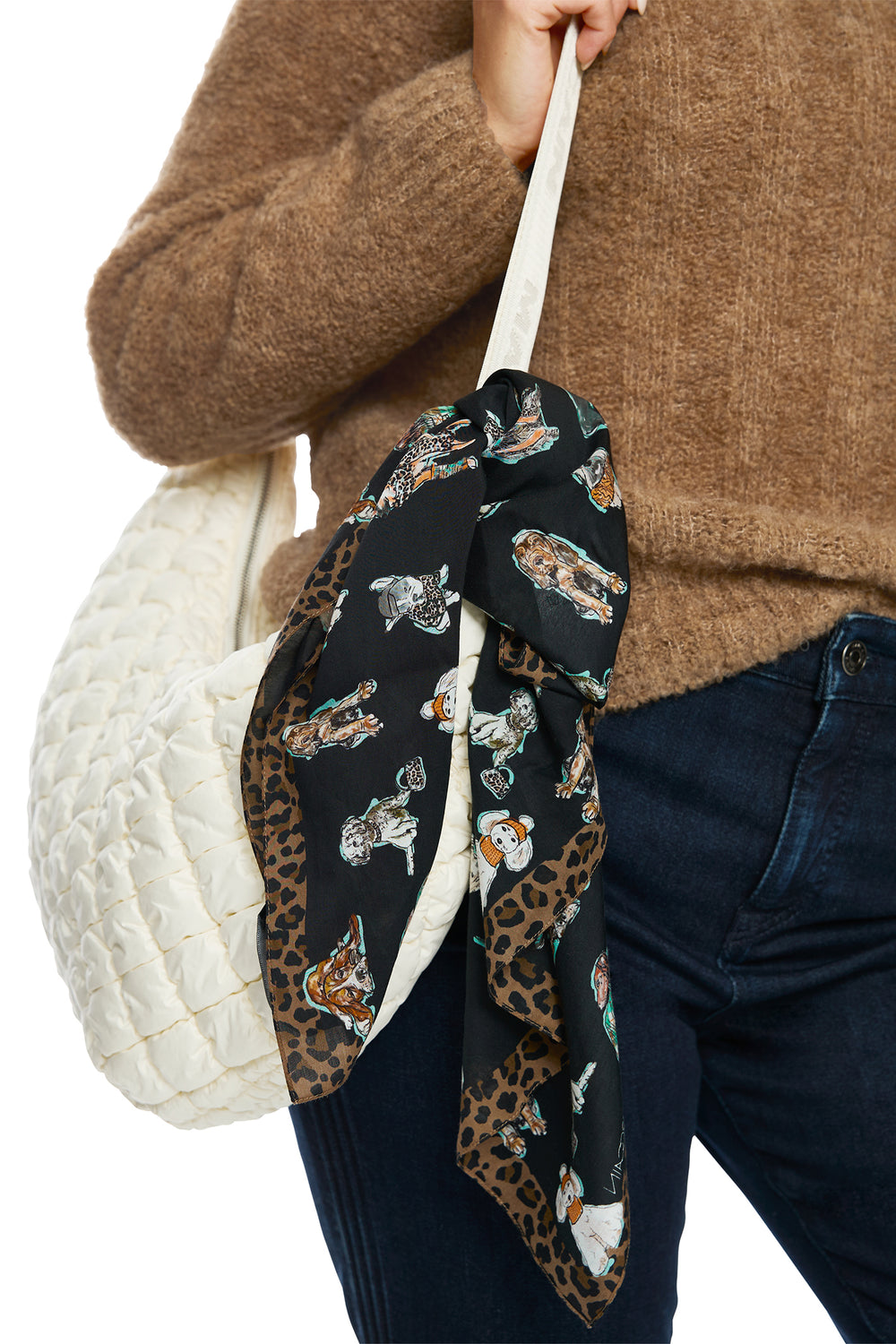 Scarf with animal print and cartoon character design on a white background