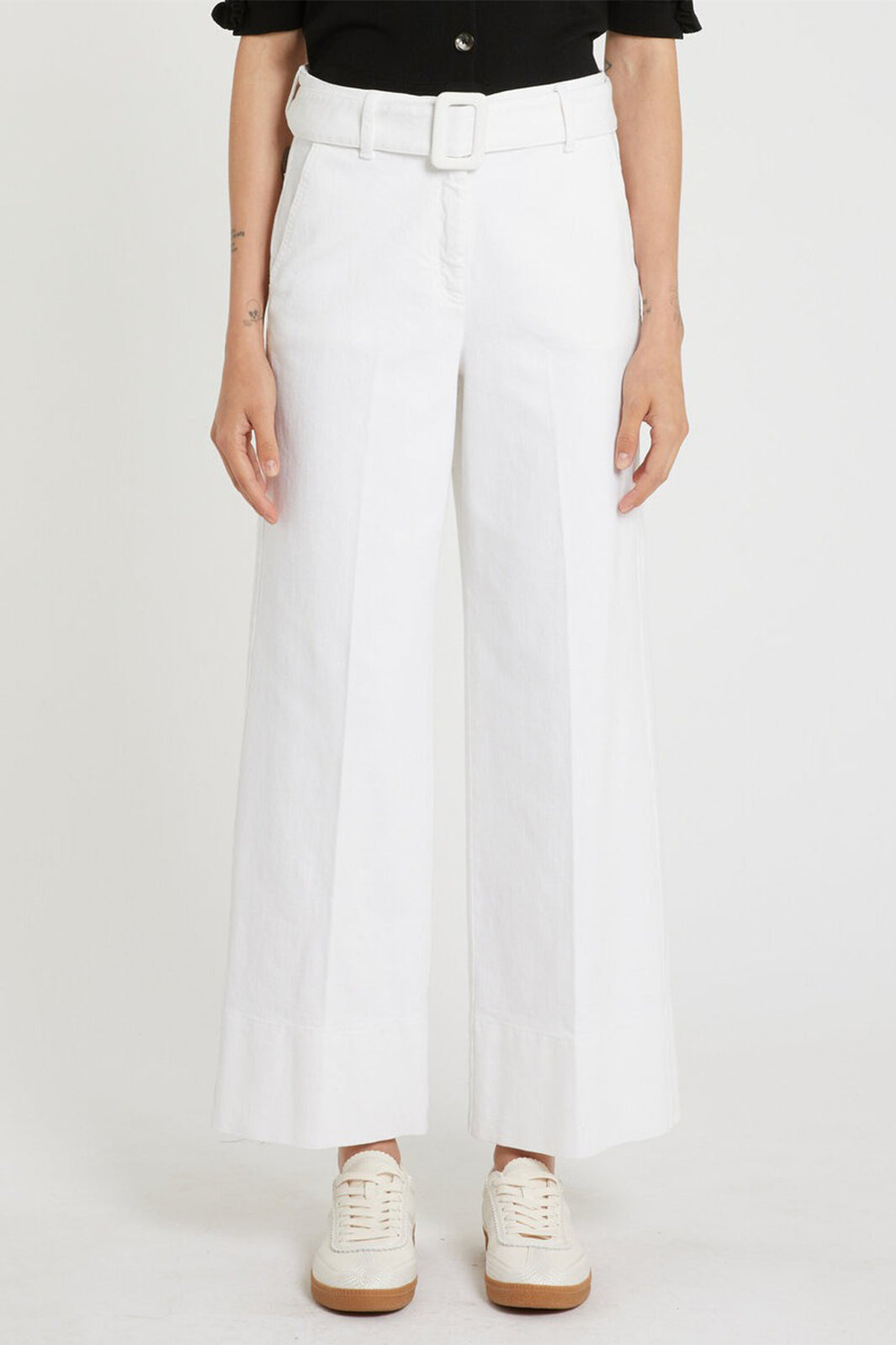 Marella MLSNICCHIA1 White Garment Cotton Wide Leg Trousers (2613131214200) are tailored summer trousers with crisp structure and relaxed volume—ideal for warm-weather outfitting. The White style is crafted in garment-dyed cotton with pleated front and matching belt.