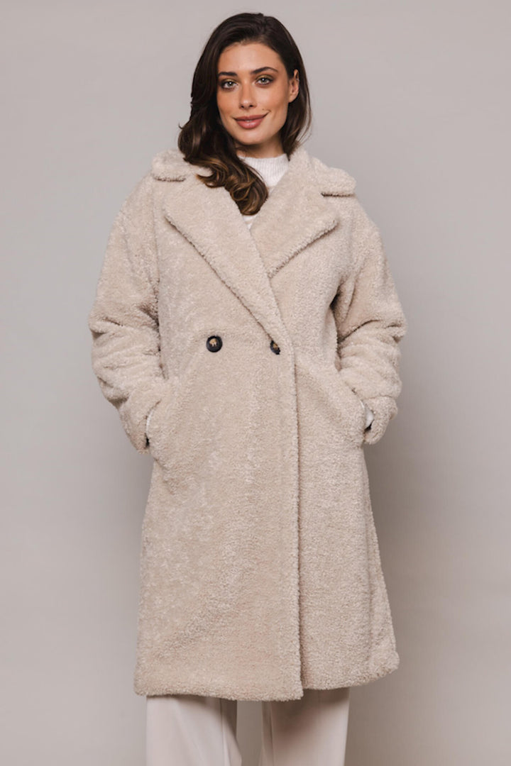 Stay stylishly warm this winter in the Rino & Pelle Jix Stone Double Breasted Coat. Made from a soft and cozy teddy bear fabric, this double-breasted coat features a lapel collar and side pockets. Fully lined for added comfort, this coat will keep you cozy in all cold weather.
